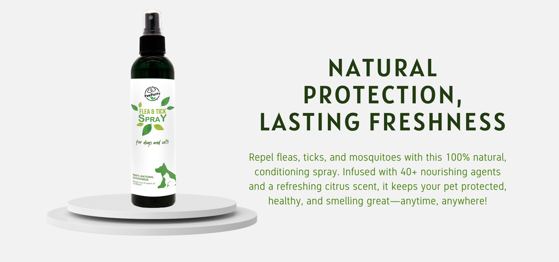 PawPurity Flea & Tick Spray contains 11 non-toxic natural flea and tick repellents to protect dogs and cats without using dangerous poisons or chemicals. This plant- and nut-oil-based formulation provides a total of 118 natural benefiting agents to improve & maintain a dog’s skin & coat.