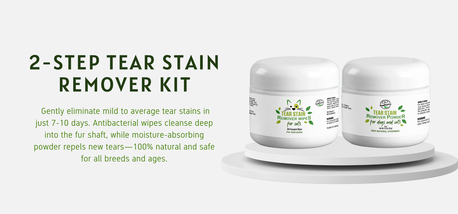 PawPurity's Tear Stain Remover Wipes & Powder Kit eliminates mild to moderate tear stains in 7-10 days, providing a lasting solution.