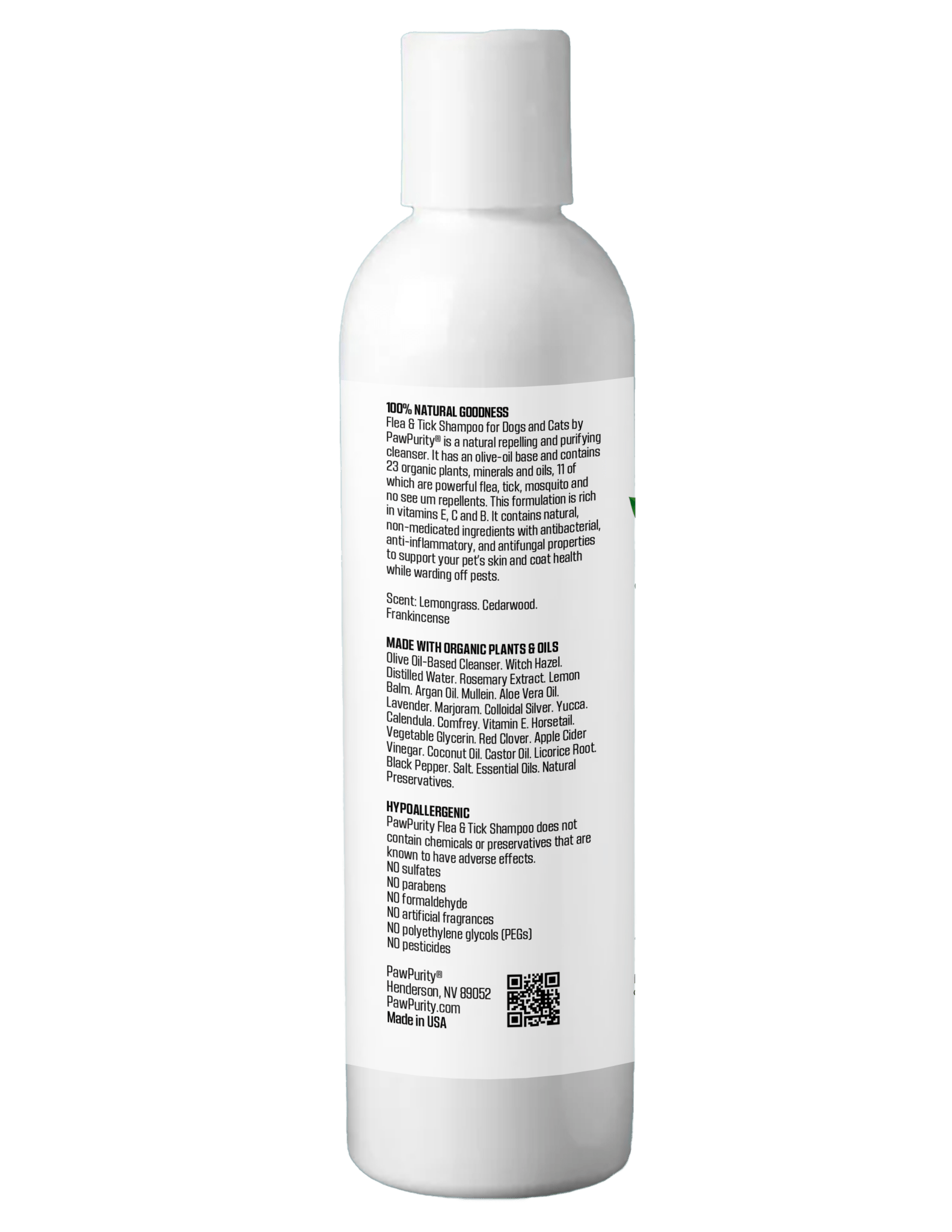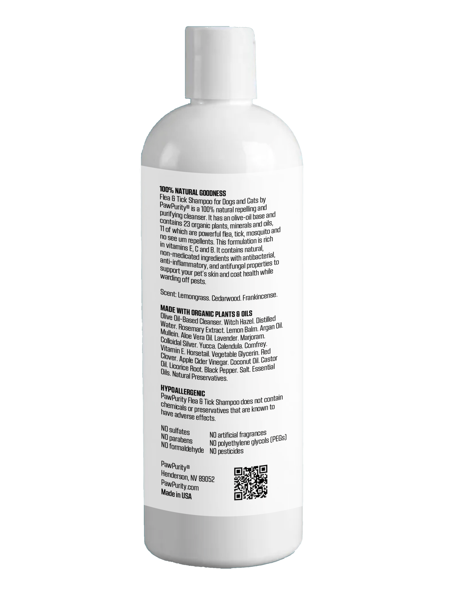 PawPurity Flea & Tick Shampoo for Dogs & Cats: Olive Oil-Based Shampoo. Aloe Vera. Distilled Water. Rosemary Extract. Mullein. Comfrey. Apple Cider Vinegar. Witch Hazel. Red Clover. Lavender. Bamboo. Chamomile. Calendula. Yucca Root. Horsetail. Rosemary. Nettle Leaf. Witch Hazel. Apple Cider Vinegar. Colloidal Silver. Salt. Essential Oils: Frankincense. Cedarwood. Lemongrass