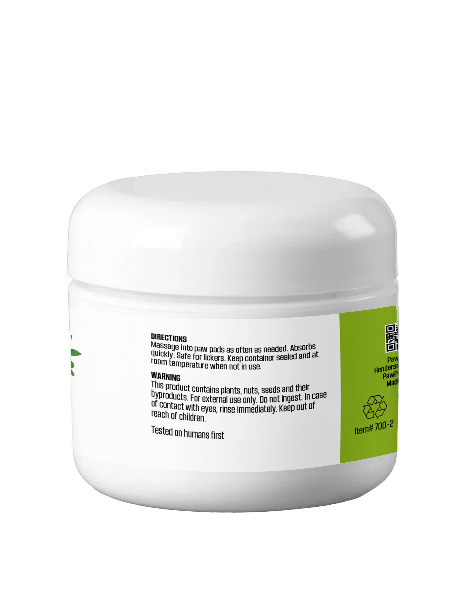 Our paw balm was formulated to restore painful dry, rough or cracked paw pads and nails quickly and naturally. It is rich in nature's most powerful antibacterial, antiseptic, antifungal, anti-inflammatory and conditioning agents. It generates new pad cell growth and strengthens the nails to keep paws resilient and healthy year round. Absorbs immediately. Restoration starts at time of application. Non-waxy so it won't make tracks in your home. Safe for even the most avid paw lickers.