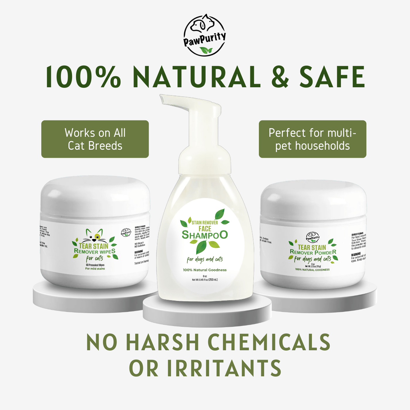 Tear stains form due to excessive tear production, yeast, and bacteria buildup. Our Tear Stain Remover Delux Bundle for Cats tackles this issue with a three-step system: cleansing, treating, and preventing. The face shampoo removes impurities, the stain remover solution fights bacteria and discoloration, and the powder absorbs moisture to prevent future staining.