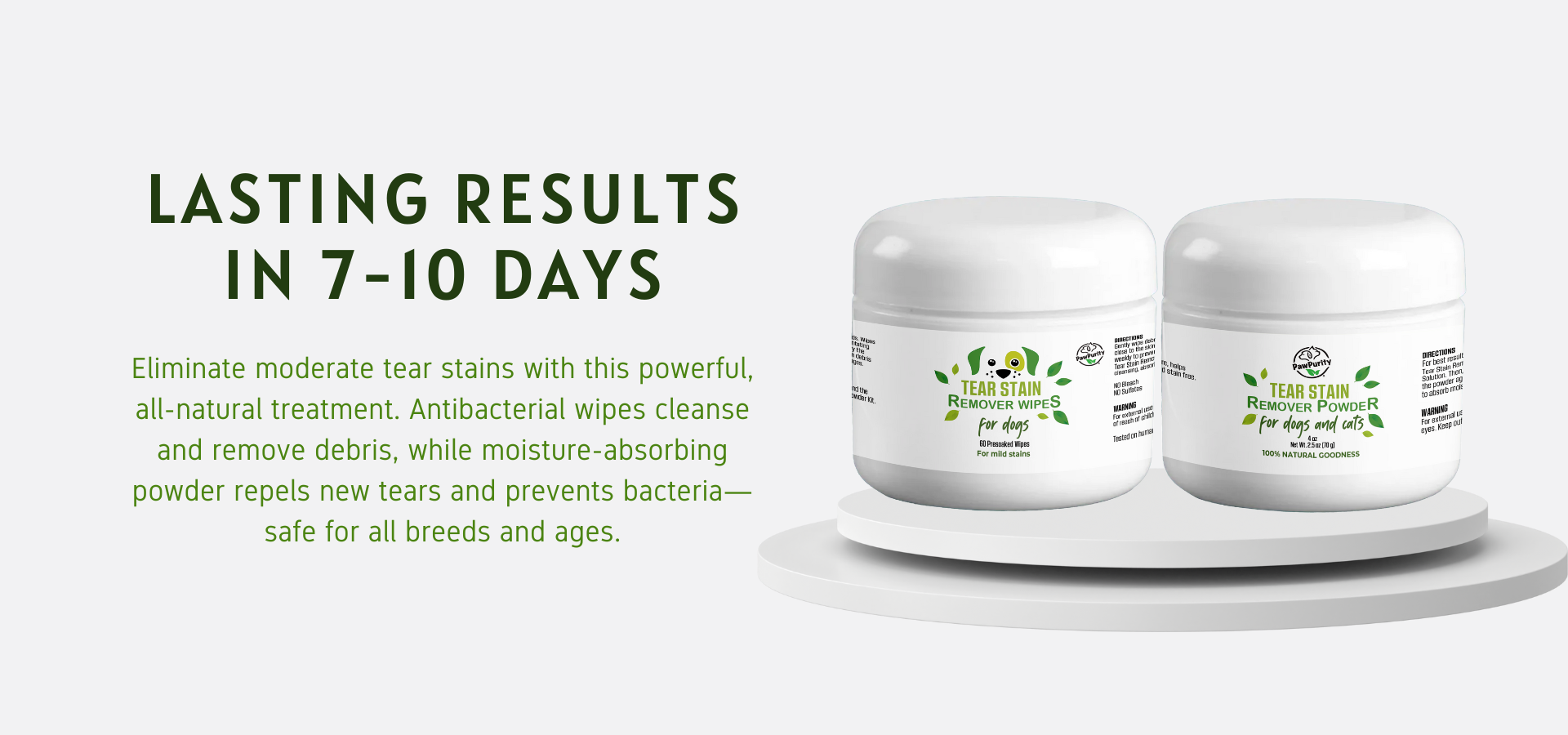 PawPurity's Tear Stain Remover Wipes & Powder Kit eliminates moderate tear stains in 7-10 days, providing a lasting solution.